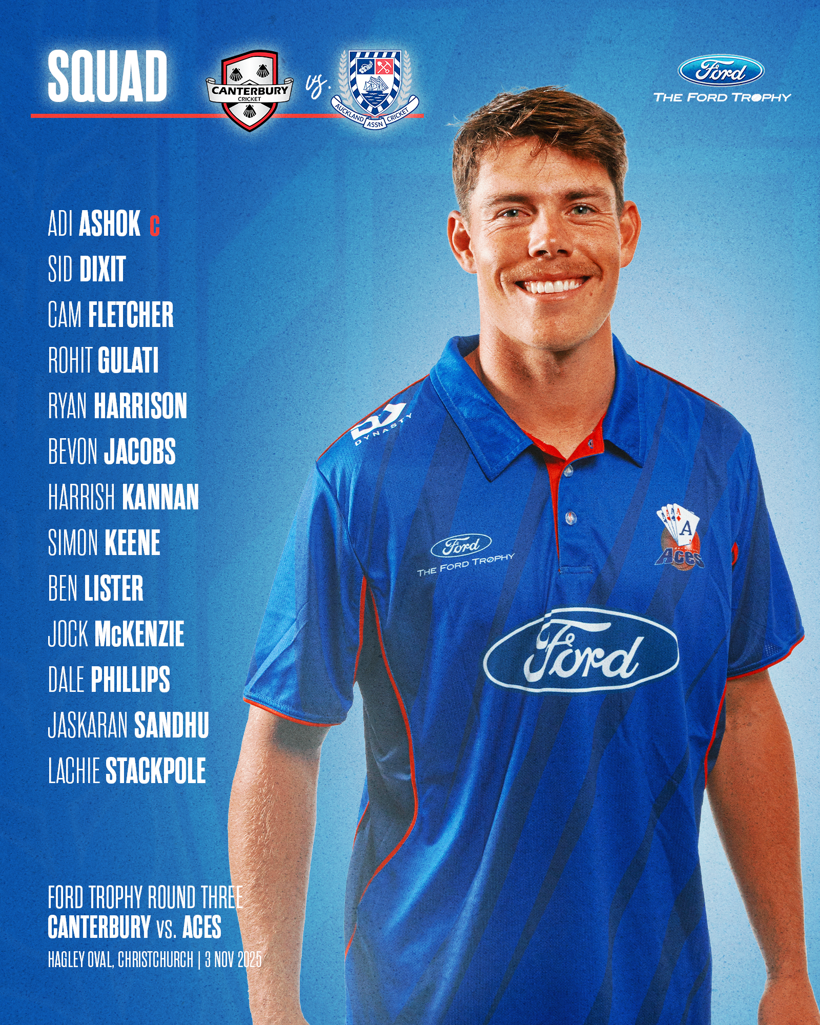 Rising star Adi Ashok will lead the ACES into a highly anticipated Ford Trophy rematch against Canterbury this Monday at Hagley Oval, as the Aucklanders look to avenge last season’s heartbreaking defeat in the 2024/25 Final.