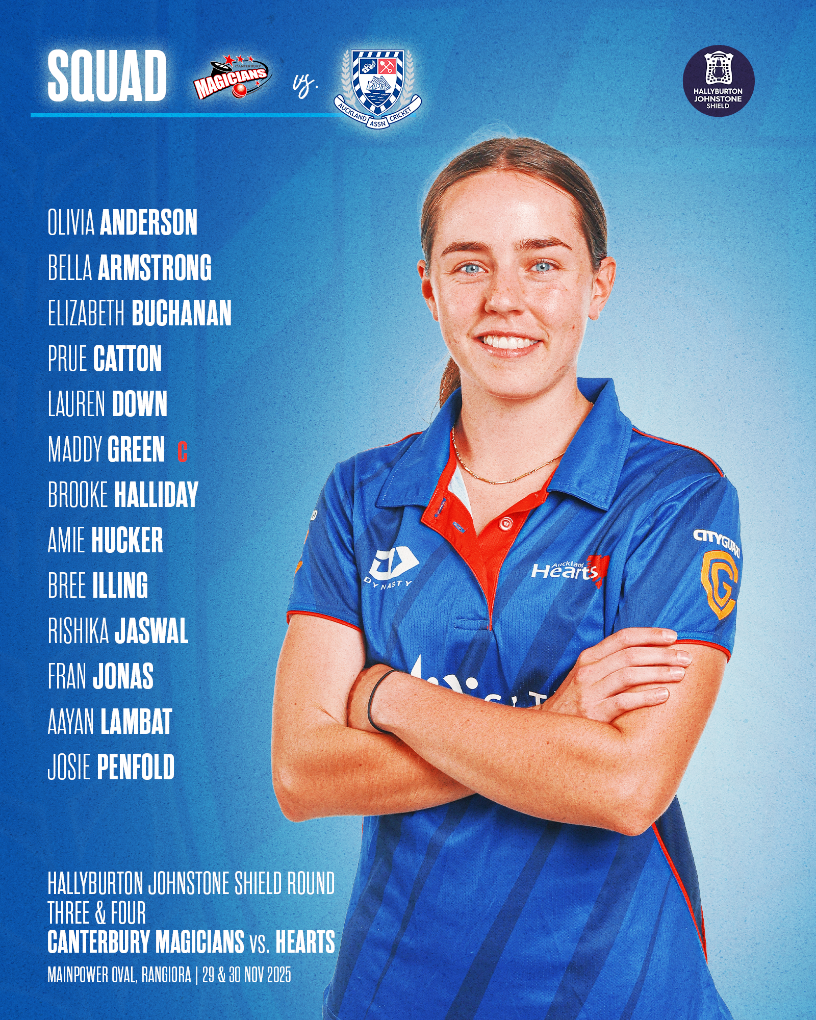 The HEARTS take on the Canterbury Magicians at MainPower Oval, Rangiora, with the first ball at 10:30am on Saturday 29 November and Sunday 30 November. Entry is free.