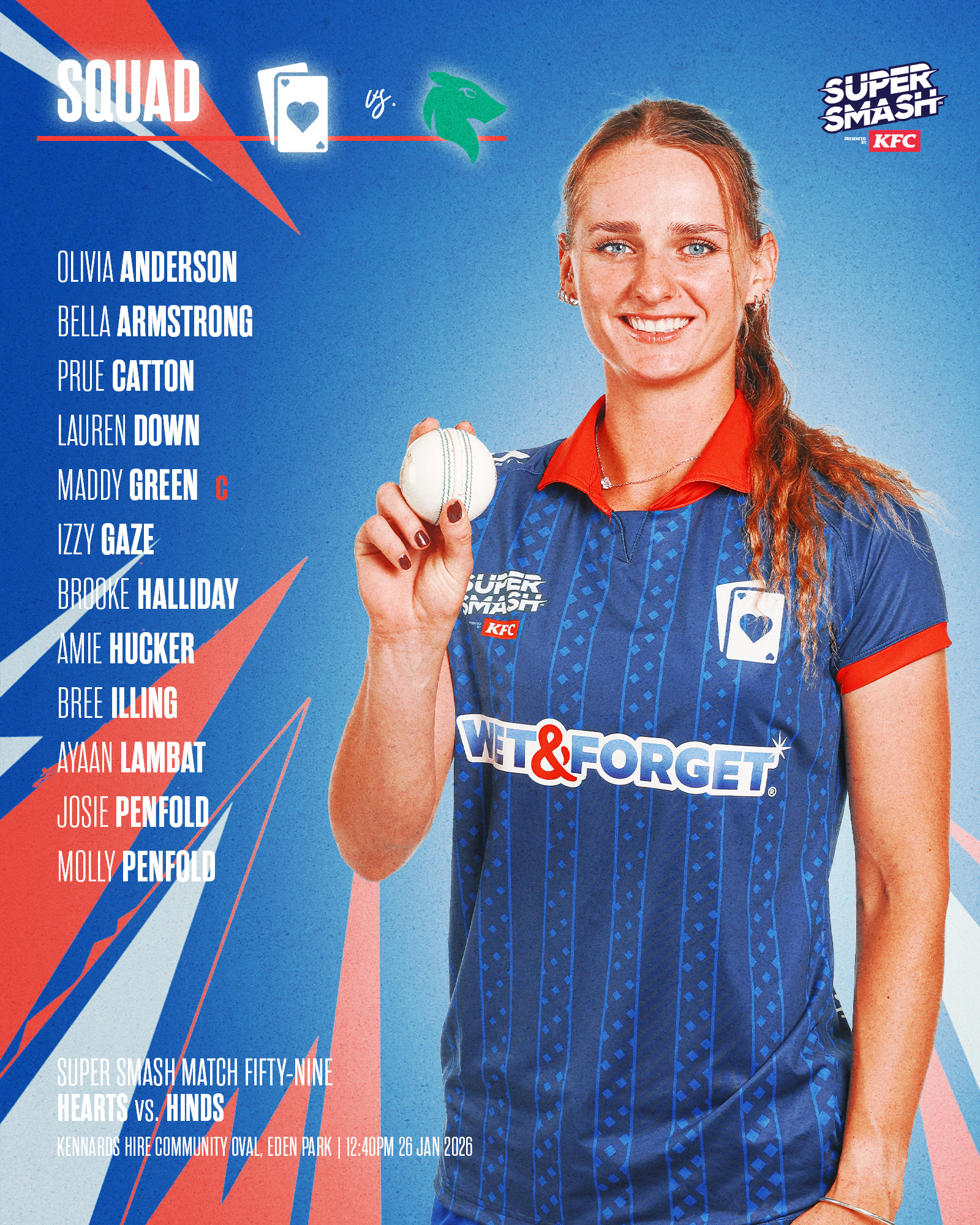 Auckland’s Super Smash summer concludes with a blockbuster Auckland Anniversary Day doubleheader at Eden Park’s Kennards Hire Community Oval on Monday 26 January, with the HEARTS taking on the Central Hinds at 12.40pm, followed by the ACES facing the Central Stags at 4.25pm.