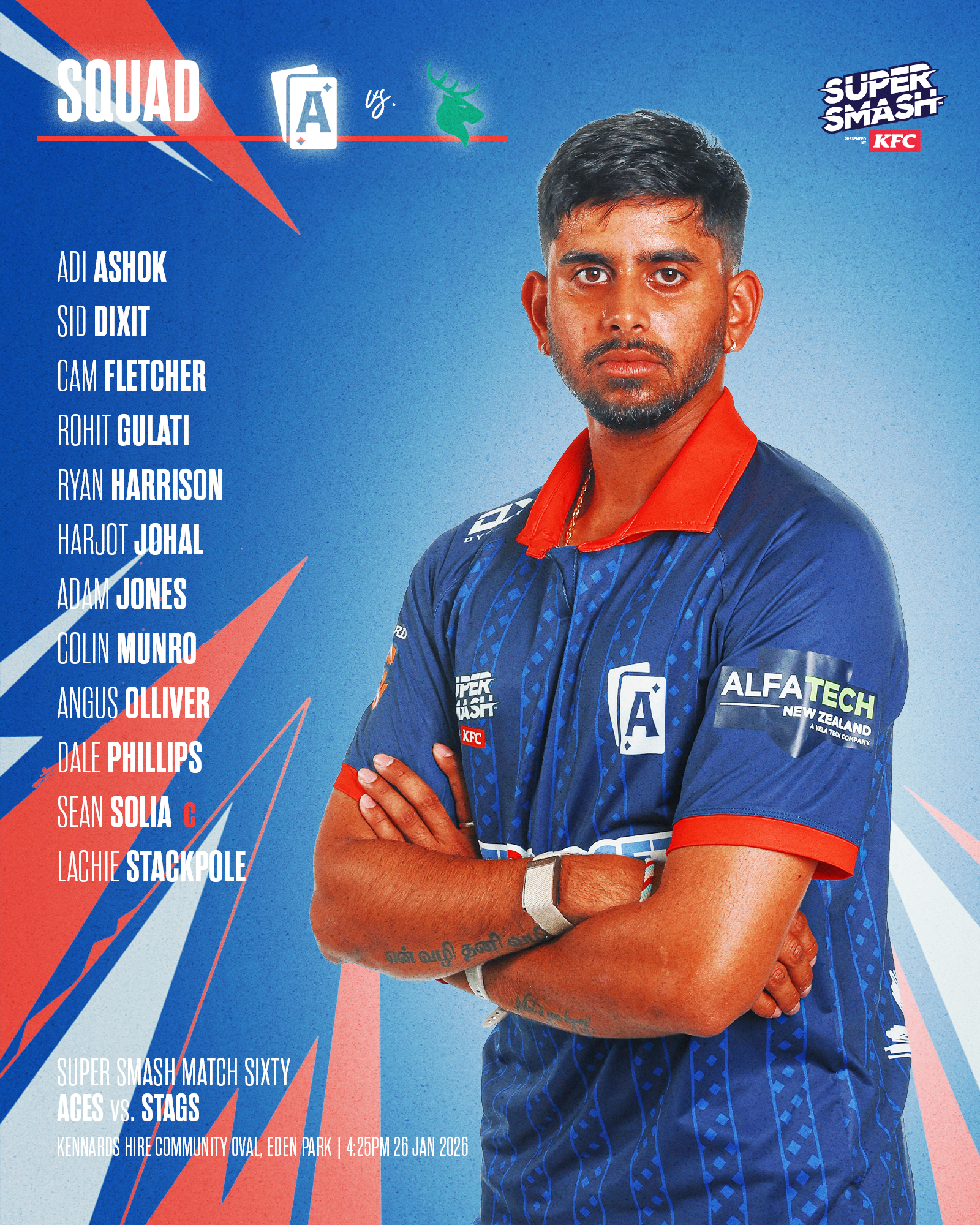 The evening match brings its own high-stakes narrative, with the Super Smash men’s ladder finely balanced heading into the final round. The ACES, the Central Stags and the Canterbury Kings are jostling for second and third positions heading into Finals Weekend, making Monday’s clash a pivotal one.